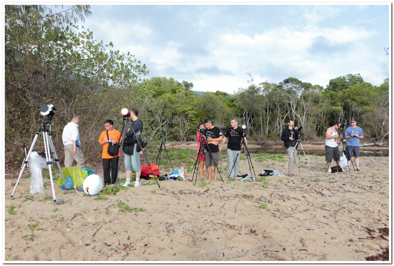 Cairns North Queensland 12/11/2012. Μετά από 5 μέρες στην πανέμορφη πόλη του Σύδνεϋ φτάσαμε στην περιοχή της έκλειψης. Η υγρασία, τα περιπλανώμενα σύννεφα και τα συνεχόμενα ντους – ψιλόβροχο - ήταν το βασικό χαρακτηριστικό του κλίματος της περιοχής. Ο καιρός ήταν άστατος και ασυνήθιστος για τα δικά μα δεδομένα, κάθε δέκα λεπτά μπορεί να ήταν διαφορετικός. Από την συννεφιά στην ηλιοφάνεια και από την ηλιοφάνεια στην ψιχάλα. Όλοι είχαμε αρχίσει να συνειδητοποιούμε ότι θα είχαμε μια ακόμα περιπετειώδη έκλειψη. Η επόμενη μέρα μία από τα ίδια, η συννεφιά και η βροχή εναλλάσσοντας με μικρά διαστήματα ηλιοφάνειας. Το απόγευμα ρίξαμε τελευταία μια ματιά στις τελευταίες προβλέψεις. Η νεφοκάλυψη ήταν εμφανής σε όλα τα πιθανά σημεία παρατήρησης, η πιθανότητα να δούμε την έκλειψη ήταν πια θέμα τύχης. Παρόλα αυτά μελετώντας καλύτερα τα προγνωστικά διαπιστώσαμε ότι υπήρχε μια τρύπα με πιο αραιή συννεφιά ανάμεσα στο port Douglass και στο Palm cove και έτσι αποφασίσαμε να πάμε στην Oak beach, που ήταν μία από τις αρχικές μας επιλογές, μιας και ήταν στο κέντρο του μονοπατιού με την μέγιστη διάρκεια ολικότητας (2 λεπτά με 5 δεύτερα) .