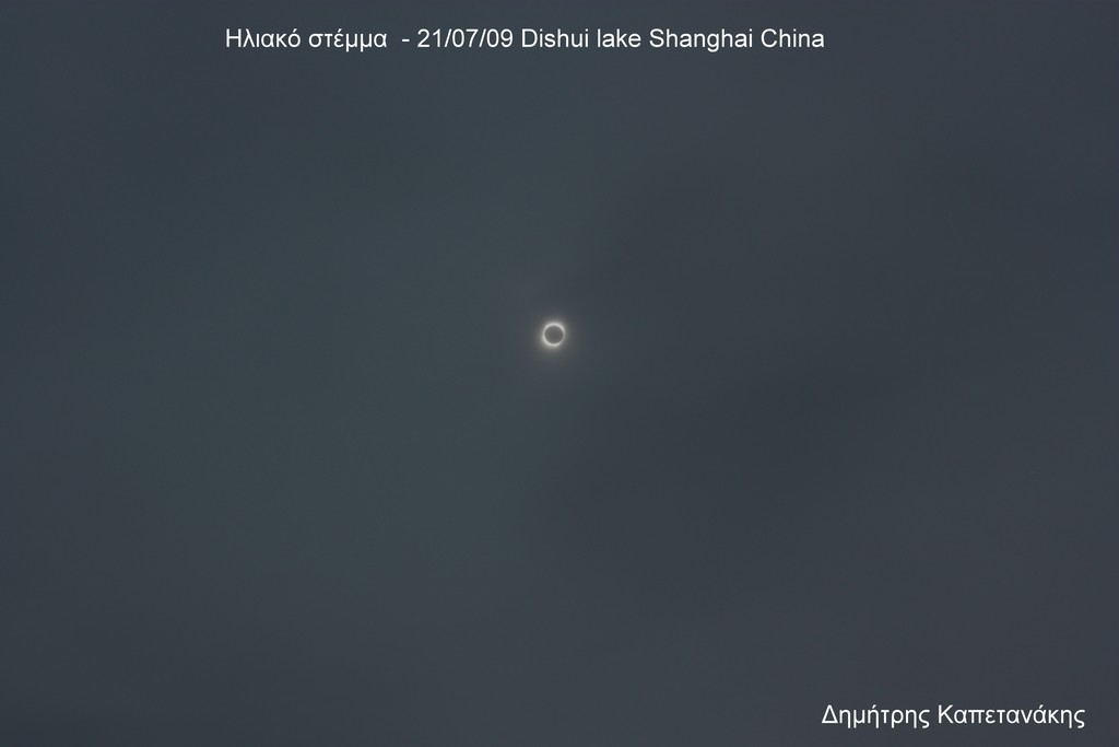 Μαζί της έφερε και υλικό - φωτογραφίες και video - από την μεγαλύτερη σε διάρκεια έκλειψη του αιώνα. Η αποστολή μετάβηκε στην Πόλη της Shanghai 4 ημέρες πριν την έκλειψη έχοντας τον καιρό ως τον μόνο αντίπαλο στα σχέδια της. Ο καιρός ήταν άστατος κυρίως με συννεφιά υψηλή υγρασία και λίγες στιγμές με Ήλιο. Τα πρωινά ήταν σχετικά καλά δίνοντας μας ελπίδες για την παρακολούθηση της έκλειψης. Μία ημέρα πριν την έκλειψη τα προγνωστικά ήταν εντελώς απογοητευτικά. Πλήρη νεφοκάλυψη και τροπικές καταιγίδες για τις δύο επόμενες ημέρες τα οποία θα άρχιζαν από το απόγευμα της Τρίτης. Τα προγνωστικά άρχισαν να επαληθεύονται την Τρίτη και αφού εξαντλήσαμε την δυνατότητα μετακίνησης σε άλλη περιοχή , αποφασίσαμε να ακολουθήσουμε το αρχικό πρόγραμμα , δηλαδή μετάβαση στην λίμνη Dishui 70 χλμ ΝΔ από την Shanghai.