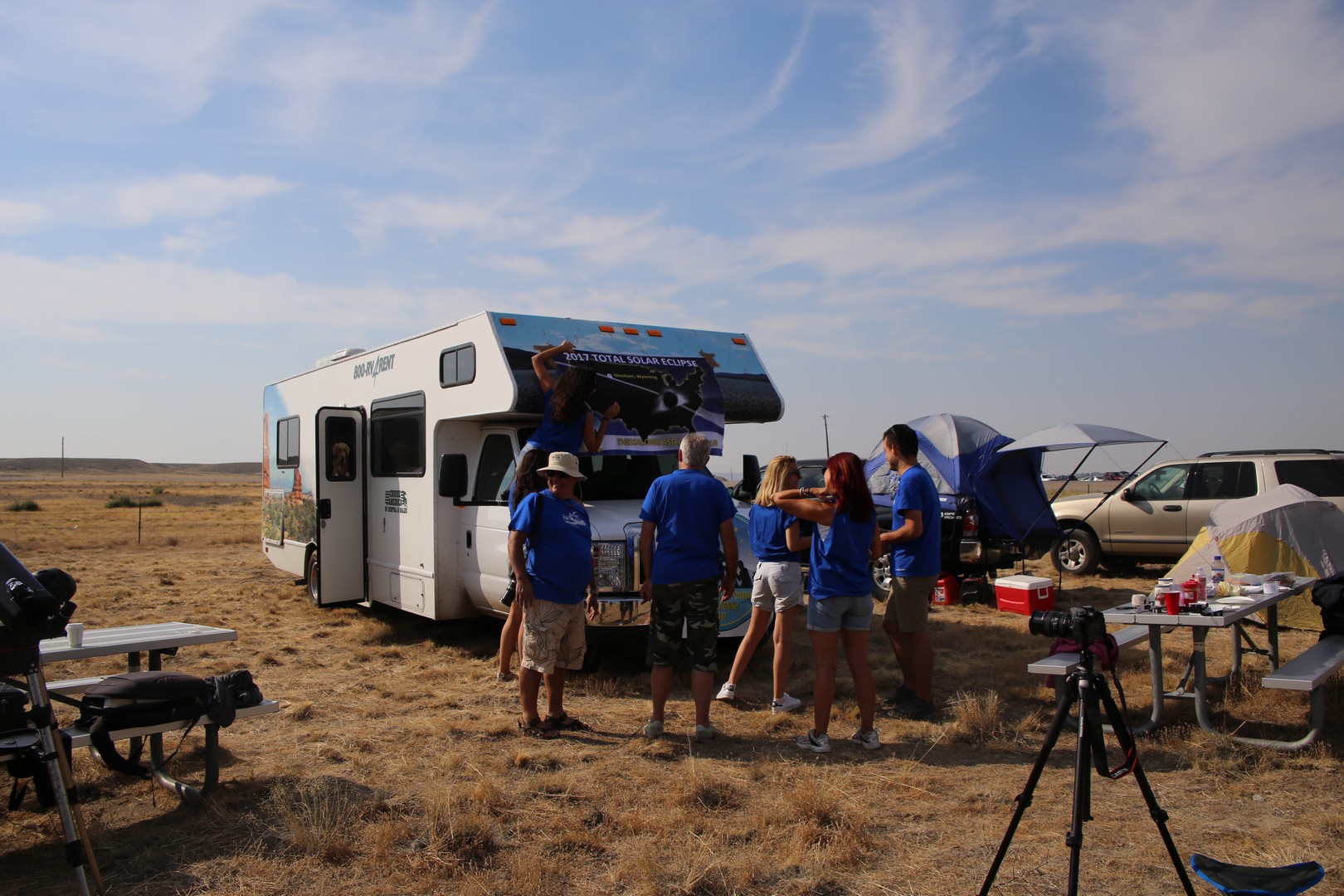 21 Αυγούστου. 11:40 συμβαίνει ο σκοπός, το κίνητρο και η ολοκλήρωση αυτής της εκδρομής! Ο ουρανός πεντακάθαρος, το φαινόμενο καθηλωτικό. Οι μηχανές και οι βιντεοκάμερες παίρνουν φωτιά. Αν δεν παρατηρήσετε μια ολική έκλειψη ηλίου αυτοπροσώπως, καμία περιγραφή, εικόνα ή βίντεο δε θα σας δώσει το μέγεθος του φαινομένου (γιατί ταξιδεύουμε σε όλο τον κόσμο να δούμε και 2η και 3η και 4η …;) Στις φάσεις της μερικότητας παίζουμε με σκιές, με τα σουρωτήρια, εξηγούμε στους γύρω. Στο τέλος της ολικότητας κραυγές, αναστεναγμοί, λυγμοί, αγκαλιές, σιωπές… τι είδαμε και τι φωτογραφίσαμε: τον φθίνοντα μηνίσκο του ήλιου, τις χάντρες του Baily, το μαργαριταρένιο δακτυλίδι, το στέμμα του ήλιου, τον Ερμή, την Αφροδίτη, το Δία, πολλά άστρα, ένα απόκοσμο σκοτάδι πάνω μας, ένα απόκοσμο ημίφως γύρω μας και ένα μουντό ηλιοβασίλεμα στον ορίζοντα. Όπως κάθε φορά, έτσι και αυτή τη φορά ο Άγγελος και ο Κίμων έχουν ετοιμάσει ειδικά μπλουζάκια για την έκλειψη! Βέβαια τα κορίτσια θέλησαν να χαράξουν την υπογραφή τους, πήραν τα ψαλίδια και έκοψαν μανίκια και πλάτες σε χαβανέζικα σχέδια!