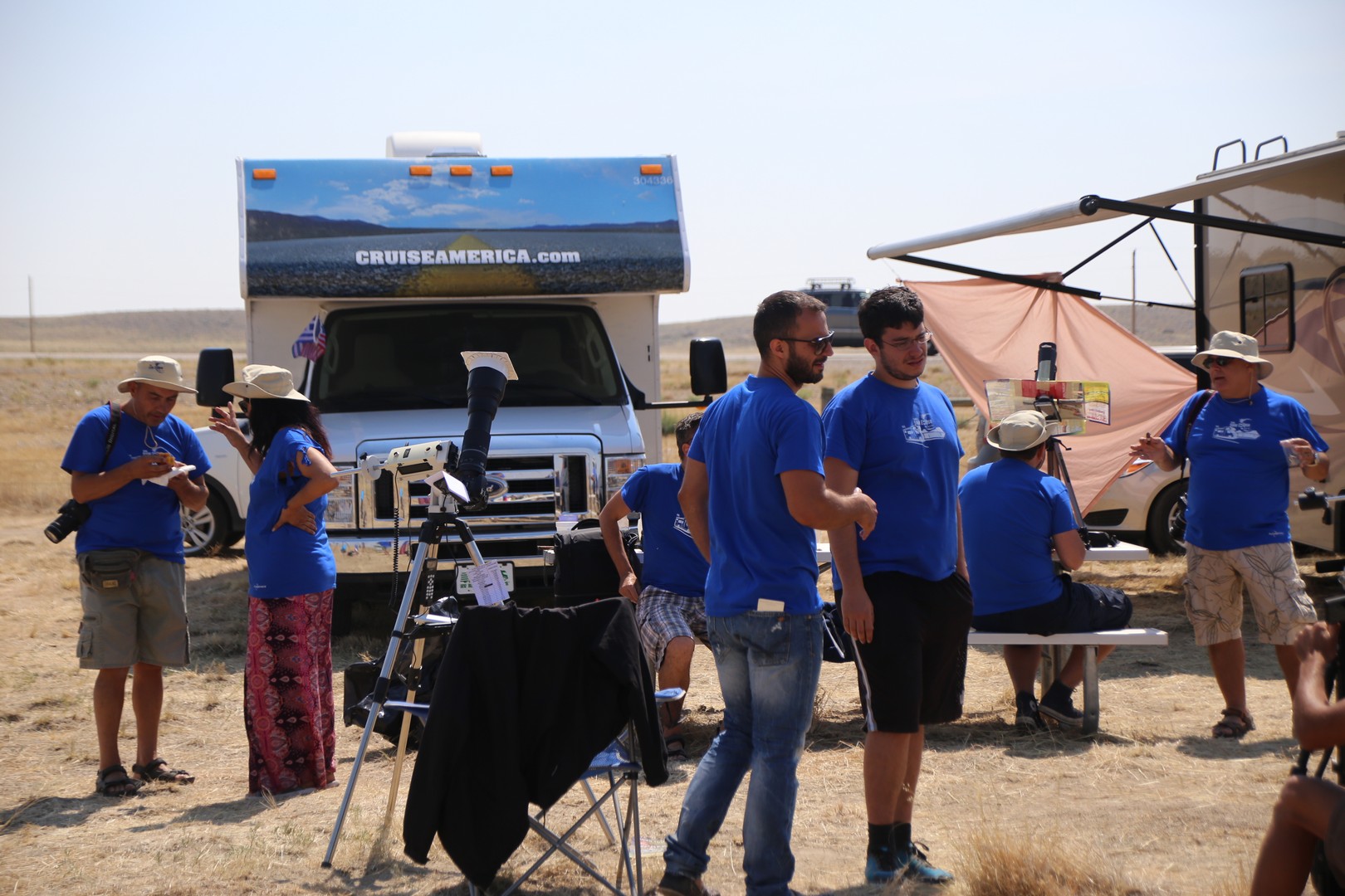 21 Αυγούστου. 11:40 συμβαίνει ο σκοπός, το κίνητρο και η ολοκλήρωση αυτής της εκδρομής! Ο ουρανός πεντακάθαρος, το φαινόμενο καθηλωτικό. Οι μηχανές και οι βιντεοκάμερες παίρνουν φωτιά. Αν δεν παρατηρήσετε μια ολική έκλειψη ηλίου αυτοπροσώπως, καμία περιγραφή, εικόνα ή βίντεο δε θα σας δώσει το μέγεθος του φαινομένου (γιατί ταξιδεύουμε σε όλο τον κόσμο να δούμε και 2η και 3η και 4η …;) Στις φάσεις της μερικότητας παίζουμε με σκιές, με τα σουρωτήρια, εξηγούμε στους γύρω. Στο τέλος της ολικότητας κραυγές, αναστεναγμοί, λυγμοί, αγκαλιές, σιωπές… τι είδαμε και τι φωτογραφίσαμε: τον φθίνοντα μηνίσκο του ήλιου, τις χάντρες του Baily, το μαργαριταρένιο δακτυλίδι, το στέμμα του ήλιου, τον Ερμή, την Αφροδίτη, το Δία, πολλά άστρα, ένα απόκοσμο σκοτάδι πάνω μας, ένα απόκοσμο ημίφως γύρω μας και ένα μουντό ηλιοβασίλεμα στον ορίζοντα. Όπως κάθε φορά, έτσι και αυτή  τη φορά ο Άγγελος και ο Κίμων έχουν ετοιμάσει ειδικά μπλουζάκια για την έκλειψη! Βέβαια τα κορίτσια θέλησαν να χαράξουν την υπογραφή τους, πήραν τα ψαλίδια και έκοψαν μανίκια και πλάτες σε χαβανέζικα σχέδια!