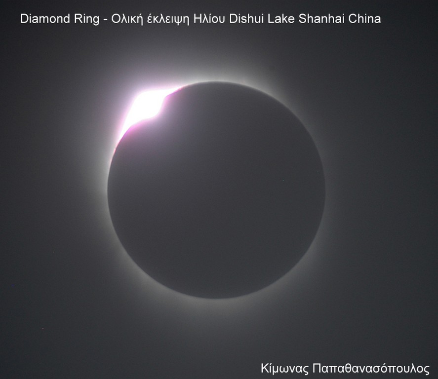 Η δεύτερη επαφή μας βρήκε απροετοίμαστους να τρέχουμε στο πλήρες σκοτάδι προς τον εξοπλισμό βλέποντας το μεγαλοπρεπές στέμμα χωρίς να το έχουμε συνειδητοποιήσει. Όλοι οι υπολογισμοί που είχαμε κάνει για χρόνους έκθεσης ήταν εκτός. Στην αρχή δεν έβγαινε τίποτα αυξάνοντας τους όμως το στέμμα άρχισε να φαίνεται στις οθόνες μας. Είχαμε όμως ένα μεγάλο πλεονέκτημα την μεγαλύτερη σε διάρκεια έκλειψη του 21ου αιώνα. Όσοι είχαν παρακολουθήσει τις δύο προηγούμενες εκλείψεις διάρκειας 2-3 λεπτών τους φάνηκε ατελείωτη. Θαυμάσαμε το στέμμα με τα μάτια και τα κιάλια και περιμέναμε το δεύτερο diamond Ring. Το σύνθημα του Βαγγέλη για 10 sec καθήλωσε το βλέμμα μας στον ουρανό και το χέρι στο Declarer. Στην αρχή κοκκίνισε , φάνηκαν τα Baileys Beads και αμέσως εμφανίστηκε λαμπερό το διαμαντένιο δακτυλίδι με μία απίστευτης λαμπρότητας διαμαντένια πέτρα. Το φως του Ήλιου «άναψε» και η νύχτα έγινε μέρα σε δύο δευτερόλεπτα. Όταν τελείωσε το φαινόμενο αλληλοκοιταχτήκαμε λίγο ώστε να διαπιστώσουμε ότι ήταν αληθινό και δεν ήταν της φαντασίας μας. Στην συνέχεια ακολούθησαν ζητωκραυγές γέλια και κλάματα από την συγκίνηση. Λίγα λεπτά αργότερα μία δυνατή βροχή επανέφερε το τοπίο στα προγνωστικά και εμάς να αδιαφορούμε που γινόμασταν μούσκεμα. Ο σκοπός μας είχε εκπληρωθεί, είχαμε δει την έκλειψη και τίποτα άλλο δεν μας ένοιαζε.